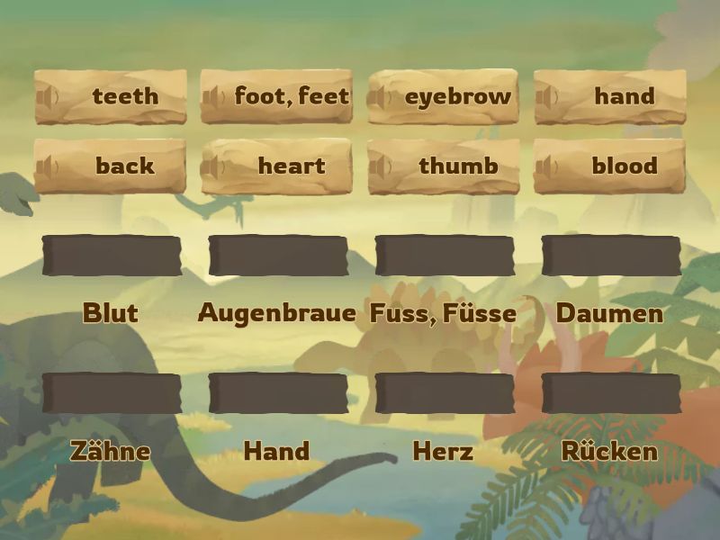 thumb - Daumen, arm - Arm, hand - Hand, toes - Zehen, nose - Nase, head - Kopf, eyebrow - Augenbraue, neck - Nacken, knee - Knie, eye - Auge, leg - Bein, body - Körper, back - Rücken, foot, feet - Fuss, Füsse, teeth - Zähne, face - Gesicht, ear - Ohr, blood - Blut, heart - Herz, heartbeat - Herzschlag, bone - Knochen, finger - Finger, muscles - Muskeln, elbow - Ellbogen,