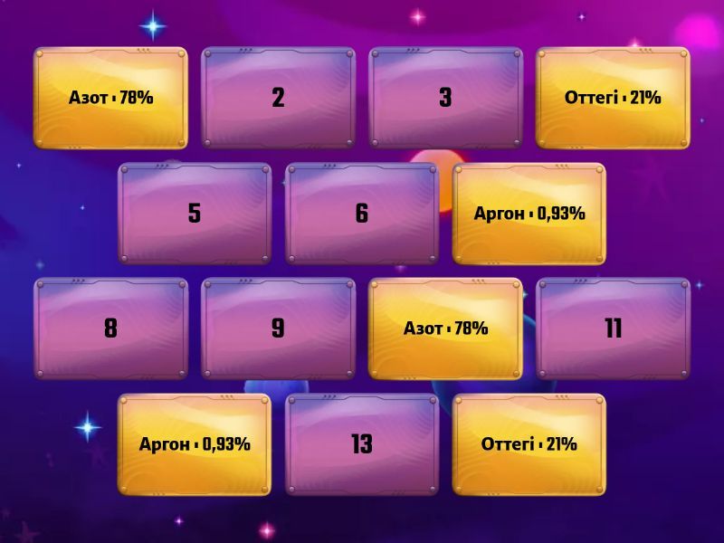 Азот : 78%, Оттегі : 21%, Аргон : 0,93%, Көмірқышқыл газы : 0,03%, Су буы : Ылғалдылықты реттейді, Озон қабаты : Ультракүлгін сәуледен қорғайды, Атмосфера : Жерді қоршап тұрған ауа қабығы,