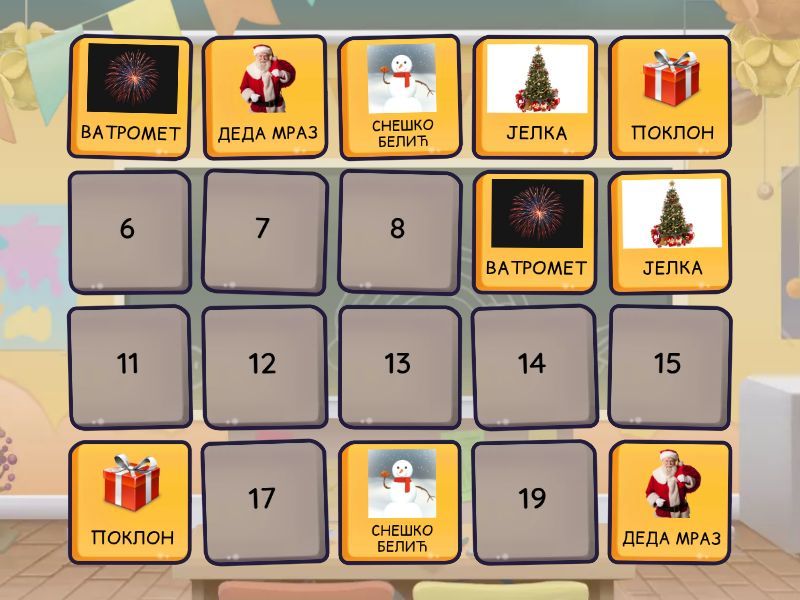 ДЕДА МРАЗ, СНЕШКО БЕЛИЋ, ЈЕЛКА, ПОКЛОН, ВАТРОМЕТ, ЗВОНЧИЋИ, ЗВЕЗДА, ИРВАС, САНКЕ, КЛИЗАЉКЕ,