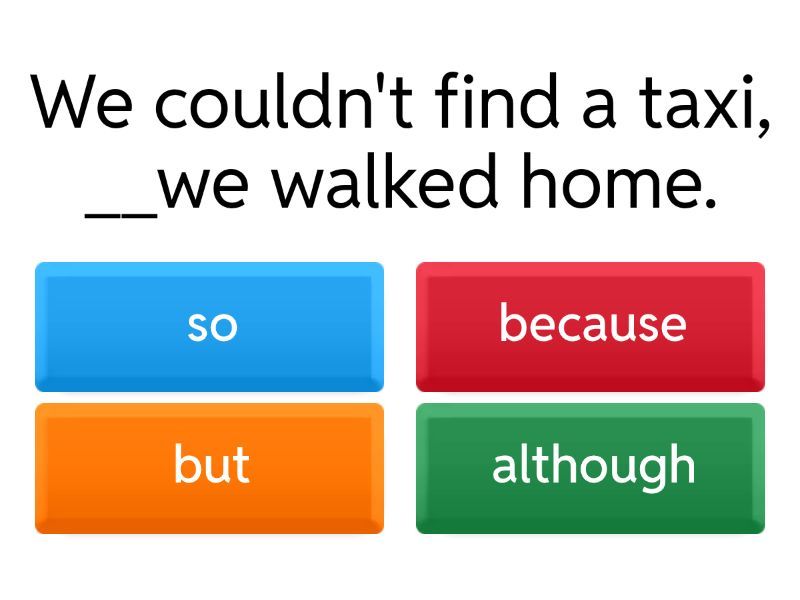 1) We couldn't find a taxi, __we walked home. a) so b) because c) but d) although 2) __ it was very cold, she wasn't wearing a coat. a) so b) because c) but d) although 3) I woke up in the night __ there was a noise. a) so b) because c) but d) although 4) I called him, __ his mobile was turned off. a) so b) because c) but d) although 5) __ she's very nice, she doesn't have many friends. a) so b) because c) but d) although 6) There was nothing on TV, __ I went to bed. a) so b) because c) but d) although 7) All the cafés were full __ it was a public holiday. a) so b) because c) but d) although 8) She wanted to be a doctor, __ she failed her exams. a) so b) because c) but d) although 9) The garden looked very beautiful, __ I took a photograph. a) so b) because c) but d) although 10) __ the team played well, they didn't win. a) so b) because c) but d) although
