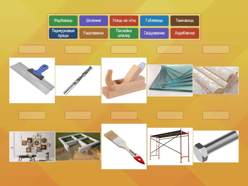 Свідраванне, Тынкаваць , Аздабленне , Габляваць , Шкленне , Фарбаваць, Рыштаванне, Узяць на ніты, Падмуркавыя працы, Паклейка шпалер,