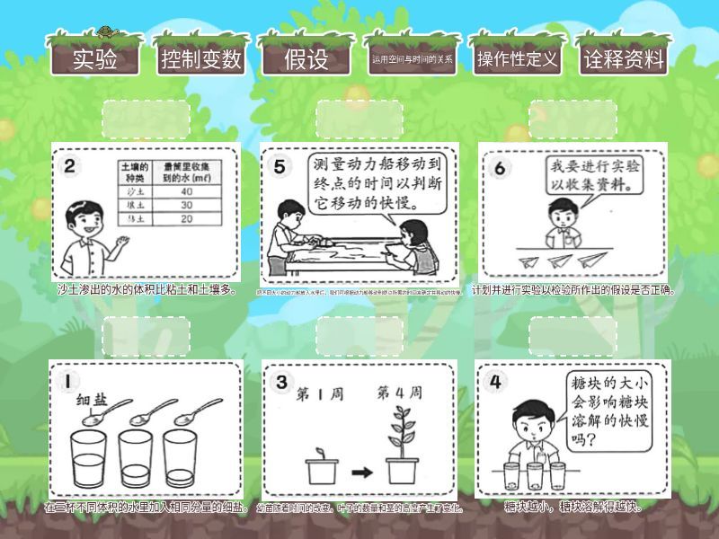 控制变数 - 在三杯不同体积的水里加入相同分量的细盐。, 诠释资料 - 沙土渗出的水的体积比粘土和土壤多。, 运用空间与时间的关系 - 幼苗随着时间的改变,叶子的数量和茎的高度产生了变化。, 假设 - 糖块越小,糖块溶解得越快。, 操作性定义 - 把不同大小的动力船放入水里后,我们可根据动力船移动到终点所需的时间来确定其移动的快慢。, 实验 - 计划并进行实验以检验所作出的假设是否正确。,