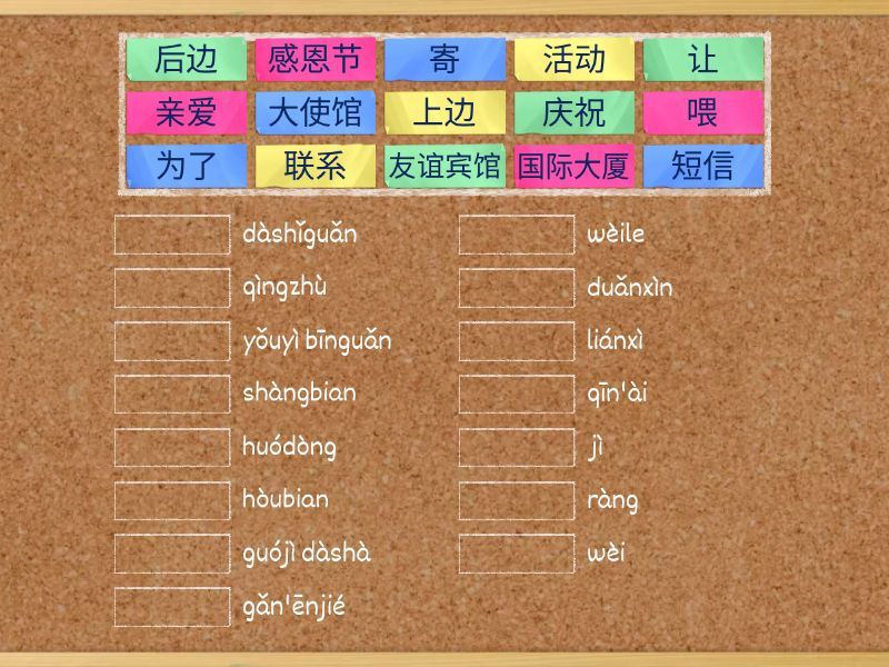 亲爱 - qīn'ài , 为了 - wèile , 庆祝 - qìngzhù , 大使馆 - dàshǐguǎn , 层 - céng , 举行 - jǔxíng , 晚会 - wǎnhuì , 地址 - dìzhǐ , 联系 - liánxì, 如果 - rúguǒ , 活动 - huódòng , 短信 - duǎnxìn , 感恩节 - gǎn'ēnjié , 喂 - wèi , 全 - quán , 让 - ràng , 过 - guò , 国际大厦 - guójì dàshà , 友谊宾馆 - yǒuyì bīnguǎn , 寄 - jì , 邮局 - yóujú , 深 - shēn , 灰色 - huīsè , 后边 - hòubian , 书店 - shūdiàn , 浅 - qiǎn , 绿色 - lǜsè , 上边 - shàngbian , 护照 - hùzhào , 忘不了 - wàng bu liǎo,