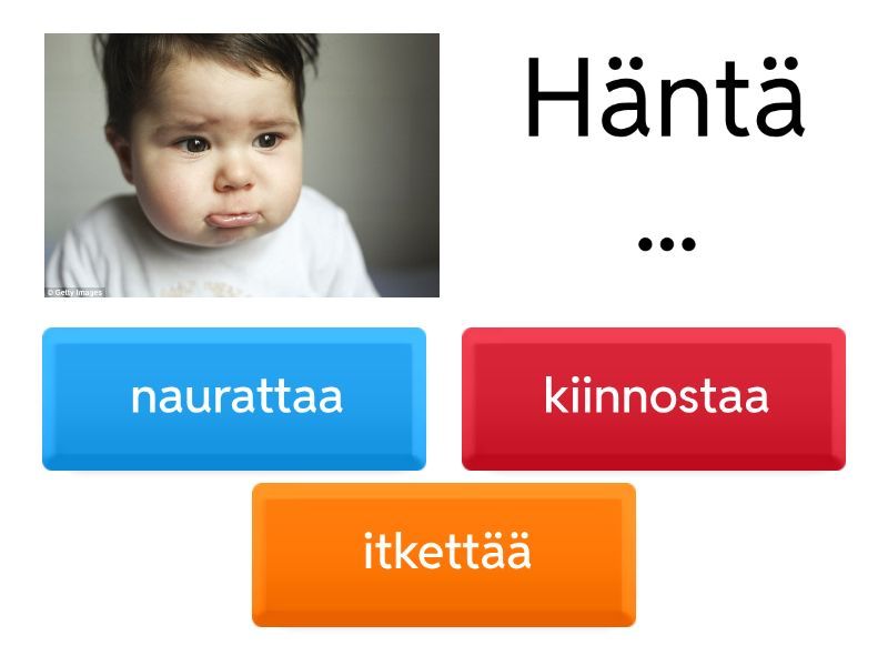 1) Häntä ... a) naurattaa b) kiinnostaa c) itkettää 2) Heitä ... a) yskittää b) naurattaa c) nukuttaa 3) Häntä ... a) inhottaa b) kiinnostaa c) paleltaa 4) Häntä ... a) janottaa b) paleltaa c) pelottaa 5) Meitä ..., että hän on aina myöhässä. a) ahdistaa b) itkettää c) harmittaa 6) Liian kova musiikki .... a) häiritsee hänet b) häiritsee häntä c) häiritsee hän