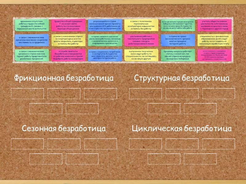Фрикционная безработица: выпускники творческих вузов ищут работу по специальности, не соглашаясь ни на какую другую, в службе занятости безработные отказываются от рабочих вакансий и просят подобрать работу менеджеров, учитель обществознания уволился по собственному желанию из школы в связи с переездом в другой город, временное отсутствие работы у трудоспособной гражданки К. связано с переменой места жительства, специалисты с финансовым образованием долго ищут работу, не соглашаясь на невысокую заработную плату, Структурная безработица: в связи с изменением спроса на энергоресурсы многие шахты закрылись, а шахтёры остались без работы, в связи с появлением персональных компьютеров машинистки остались без работы, в стране Z сократились потребление и экспорт угля, большинство шахт закрылось, десятки тысяч шахтёров потеряли работу, увольнение рабочих с текстильного предприятия связано с вводом роботизированной линии, из-за планового сокращения в связи с переоснащением вооружённых сил были уволены 20 000 военнослужащих «устаревших» специальностей, Сезонная безработица: полгода жители городка на морском побережье обслуживают туристов, а в остальное время большинство из них не могут найти себе работу, продавец кукурузы работает летом, а зимой нет, так как нет спроса на кукурузу на морском побережье, трудоспособный гражданин Г. не может найти работу после окончания периода сбора урожая, Циклическая безработица: в связи с экономическим кризисом компании сократили численность сотрудников, в связи с экономическим кризисом в стране массово теряют работу представители различных профессий, в стране во время экономического кризиса многие граждане потеряли работу, разразившийся в стране экономический кризис привёл к увольнению 30% работников во всех отраслях промышленности, в стране Y начались массовые увольнения работников, связанные с экономическим кризисом и сокращением производства,