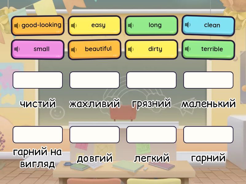 fast - швидкий, expensive - дорогий, beautiful - гарний, ugly - потворний, slow - повільний, small - маленький, tall - високий, big - великий, good-looking - гарний на вигляд, bad - поганий, good - добрий, old - старий, new - новий, cheap - дешевий, terrible - жахливий, fantastic - фантастичний , long - довгий, great - великий-гарний, clean - чистий, easy - легкий, difficult - важкий, dirty - грязний, short - короткий,