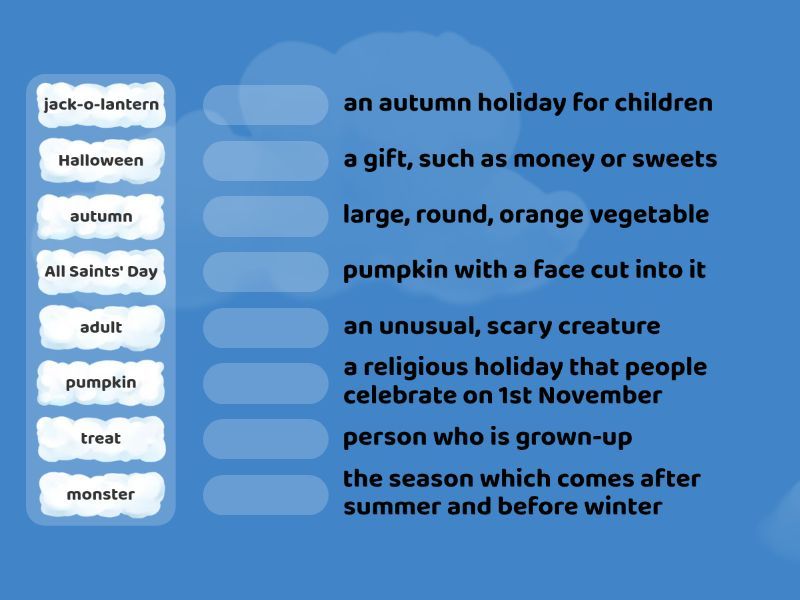jack-o-lantern - pumpkin with a face cut into it, pumpkin - large, round, orange vegetable, monster - an unusual, scary creature, treat - a gift, such as money or sweets, autumn - the season which comes after summer and before winter, Halloween - an autumn holiday for children, All Saints' Day - a religious holiday that people celebrate on 1st November, adult - person who is grown-up,