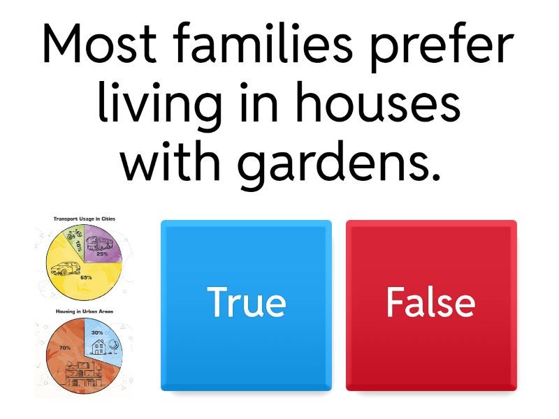 1) Most families prefer living in houses with gardens. a) True b) False 2) Most people travel by bike. a) True b) False 3) Fewer people drive their cars to work. a) True b) False 4) The most used means of transport is the car. a) True b) False 5) Most people use the car to move around the city. a) True b) False 6) Only a small percentage of people travel by bike. a) True b) False 7) A quarter of the population uses public transport. a) True b) False 8) More people use the car than all other transport methods combined. a) True b) False 9) Most people live in houses in urban areas. a) True b) False 10) Only 30% of people live in apartments. a) True b) False 11) Fewer people live in apartments than in houses. a) True b) False 12) Bikes are the least used means of transport. a) True b) False