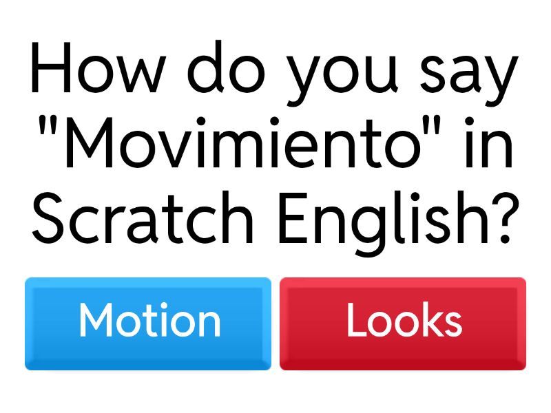 1) How do you say "Movimiento" in Scratch English? a) Motion b) Looks 2) How do you say "Flecha Izquierda" in Scratch English? a) Left arrow b) up arrow 3) How do you say "apariencia" in Scratch English? a) looks b) events 4) How do you say "si" in Scratch English? a) If b) Yes 5) How do you say "Cuando" in Scratch English? a) When b) Cuandetion 6) How do you say "error" in Scratch English? a) Bug b) Run 7) How do you say “empezar” in Scratch English? a) Run b) Print 8) How do you say "Algoritmos" in Scratch English? a) Algorithms b) When 9) How do you say "Repetir" in Scratch English? a) Repeat b) Loops 10) How do you say "Condicionales" in Scratch English? a) Condinationals b) Conditionals 11) How do you say "hola" in Scratch English? a) Hello b) Ji