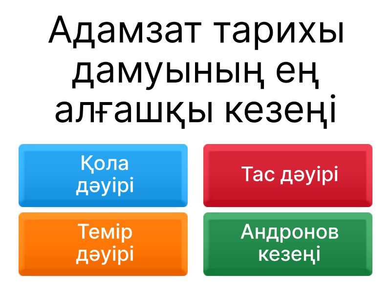 1) Адамзат тарихы дамуының ең алғашқы кезеңі a) Қола дәуірі b) Тас дәуірі c) Темір дәуірі d) Андронов кезеңі 2) Алғашқы адамдардың бастапқы кезеңдегі топтасу жүйесі a) Тобыр b) Рулық c) Тайпалық d) Қауымдастық 3) Қоғамда алғашқы ірі еңбек бөлінісін туғызған жағдай a) терімшіліктің дамуы b) аңшылықтың тууы c) шаруашылықтың егіншілік пен мал шаруашылығы болып бөлінуі d) темірді пайдалану 4) Ежелгі адамдардың ең алғашқы кәсібі a) Терімшілік b) Терімшілік пен жеміс өсіру c) Егіншілік d) Аң аулау мен балық аулап күнелту 5) Қазақстан территориясындағы ежелгі адам іздері қай дәуірге жатады a) Орта тас дәуірі b) Кейінгі тас дәуірі c) Мезолит дәуірі d) Ерте тас дәуірі 6) Кейінгі палеолит дәуірінің хронологиясын ата a) Б.з.б 10мың – 5мың жыл b) Б.з.б 5мың – 2мың жыл c) Б.з.б 40мың – 12мың жыл d) Б.з.б 140мың – 40мың жыл 7) Мезолит дәуірінің ескерткіші – Дүзбай тұрағы Қазақстанның қай жерінен табылды a) Батыс Қазақстан b) Оңтүстік Қазақстан c) Шығыс Қазақстан d) Солтүстік Қазақстан 8) Қытай адамы» қалай аталады a) Синантроп b) Австралопитек c) Неандертальдық d) Питекантроп 9) Неолит дәуірінде тас өңдеу техникасының қандай тәсілі пайда болды a) Түзету арқылы өңдеу тәсілі b) Жылтырата тегістеу тәсілі c) Жарып түсіру тәсілі d) Қалақтар жасау тәсілі 10) Қазақстан территориясынан қанша неолиттік және энеолиттік ескерткіштер табылды a) 1000 b) 950 c) 700 d) 600 11) Кейінгі палеолит дәуірінде күрделі діни сенімнің болғандығын не көрсетеді a) Мәйітті өртеу b) Мәйіттің аяғын бүгіп, бір қырымен жатқызу c) Мәйітке қызыл бояу жағу d) Еңбек құралдарын бірге көму 12) Тік жүретін адам қай дәуірде өмір сүрген a) Мезолит b) Ежелгі палеолит c) Неолит d) Кейінгі палеолит 13) Орталық Қазақстан жеріндегі кейінгі полеолитке жататын 300-ге таяу тас қүрал шыққан ең көрнекті көне мекен a) Шабақты b) Атасу c) Қарасу d) Батпақ 14) Алғашқы еңбек құралдарының атауы a) Нуклеус b) Болас c) Чоппер d) Гарпун 15) Тас дәуірінде ру ішіндегі барлық мәселелер шешілді a) Жалпы жиналыста b) Аналар кеңесінде c) Еркектер кеңесінде d) Ақсақалдар кеңесінде 16) Неолит дәуірінің Шығыс Қазақстан жеріндегі тұрағы a) Шабақты b) Ертіс c) Алтай тұрағы d) Усть-Нарым 17) Қола дәуірінің хронологиясын анықта a) Б.з.б ХVІІІ-VІІІ ғасырлар b) Б.з.б ХVІ-V ғасырлар c) Б.з.б VІІІ-ІІІ ғасырлар d) Б.з.б ІІ - б.з І ғасырлар 18) Беғазы қонысы Қазақстанның қай аймағынан табылды a) Оңтүстік Қазақстан b) Орталық Қазақстан c) Сырдария бойы d) Шығыс Қазақстан 19) Адроновтықтар қоғамында негізгі топ кімдер болып есептелді a) Малшылар b) Қолөнершілер c) Ақсүйектер d) Жауынгерлер 20) Батыс Қазақстандағы андронов мәдениетінің ескерткіштерін тапқан археолог кім a) Б.Андрианов-1914 жыл b) Х.Алпысбаев-1958 жыл c) А.Максимова-1960 жыл d) М.Грязнов-1927 жыл 21) Андронов мәдениетінің тайпалары қай жерді мекендеді a) Шығыс Еуропа мен Қазақстанды b) Батыс Сібір мен Қазақстанды c) Қытай мен Қазақстанды d) Батыс Еуропа мен Қазақстанды 22) Адроновтық тайпалар қай тілде сөйлеген a) Үнді – еуропалық тіл b) Түркі тілі c) Монғол тілі d) Үнді – ирандық тіл 23) Қола дәуірінде мыс кендері қай жерде өндірілді a) Атасу, Қалба b) Степняк, Ақжал c) Жезқазған,Зырян d) Тарбағатай, Бөкентау 24) Теңсіздіктің шығуы қай кезеңде болды a) Қола b) Мезолит c) Неолит d) Палеолит 25) Тасқа салынған суреттердің ғылыми атауы a) Иероглиф b) Петроглиф c) Руника d) Архитектура 26) Андроновтардың құрбандық шалу рәсімдері қай жерлерде жасалған a) Үйлерінің жанында b) Көш тоқтаған жерде c) Егістік алқап