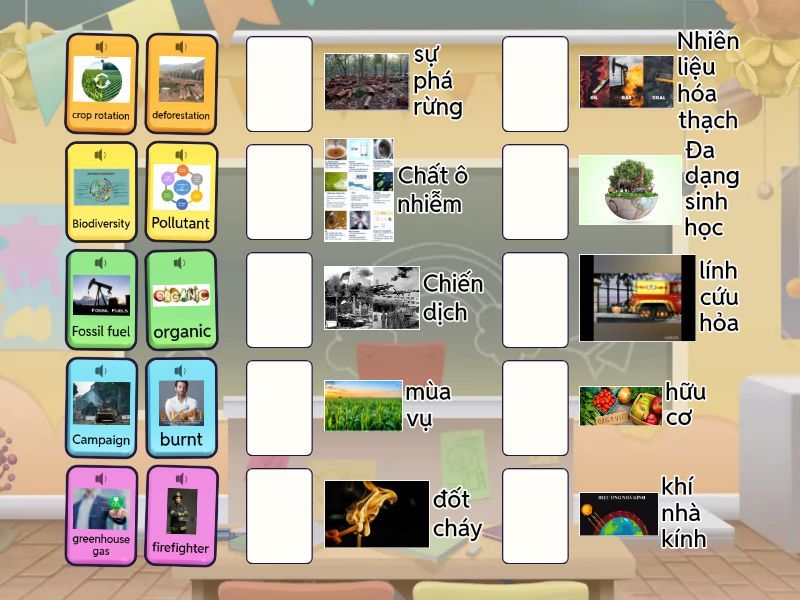 coal - than đá, cut down - chặt, đốn, deforestation - sự phá rừng, emission - sự phát thải, environment - môi trường , renewable - tái tạo, benefit - lợi ích, Campaign - Chiến dịch , Experience - kinh nhiệm, Fossil fuel - Nhiên liệu hóa thạch, Pollutant - Chất ô nhiễm, burnt - đốt cháy, greenhouse gas - khí nhà kính, space - không gian, firefighter - lính cứu hỏa, organic - hữu cơ, crop rotation - mùa vụ, landfill - bãi rác, Human activity - Hoạt động của con người, Biodiversity - Đa dạng sinh học,