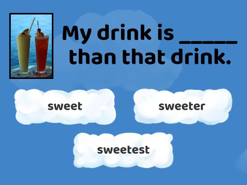 1) My drink is _____ than that drink. a) sweet b) sweeter c) sweetest 2) My ribbon is _____ than yours. a) long b) longer c) longest 3) This is the _____ building in the city. a) tall b) taller c) tallest 4) My brother has the _____ voice in the family. a) loud b) louder c) loudest 5) Kelly is a _____ girl. a) quiet b) quieter c) quietest 6) Jack is the _____ boy I know. a) nice b) nicer c) nicest 7) Mdm Teng is _____ than Mr Lim. a) fierce b) fiercer c) fiercest 8) This bowl of noodles tastes _____ than that one. a) good b) better c) best 9) Tom is a _____ boy. He is not afraid to be alone in the dark. a) brave b) braver c) bravest 10) The tortoise is the ____ animal among all the animals that take part in the race. a) slow b) slower c) slowest