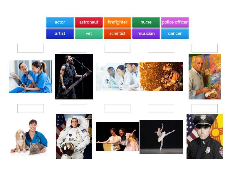 dancer, police officer, musician, actor, nurse, artist, vet, astronaut, scientist, firefighter,