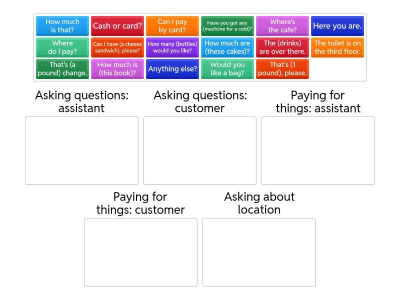 Asking questions: assistant: How many (bottles) would you like?, Would you like a bag?, Anything else?, Here you are., Asking questions: customer: Have you got any (medicine for a cold)?, Can I have (a cheese sandwich), please?, Paying for things: assistant: That's (1 pound), please., That's (a pound) change., Cash or card?, Paying for things: customer: Where do I pay?, How much is (this book)?, How much are (these cakes)?, How much is that?, Can I pay by card?, Asking about location: Where's the cafe?, The (drinks) are over there., The toilet is on the third floor.,
