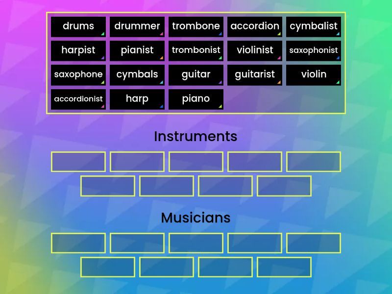 Instruments: accordion, cymbals, drums, trombone, harp, piano, saxophone, guitar, violin, Musicians: drummer, guitarist, violinist, cymbalist, harpist, saxophonist, pianist, accordionist, trombonist,