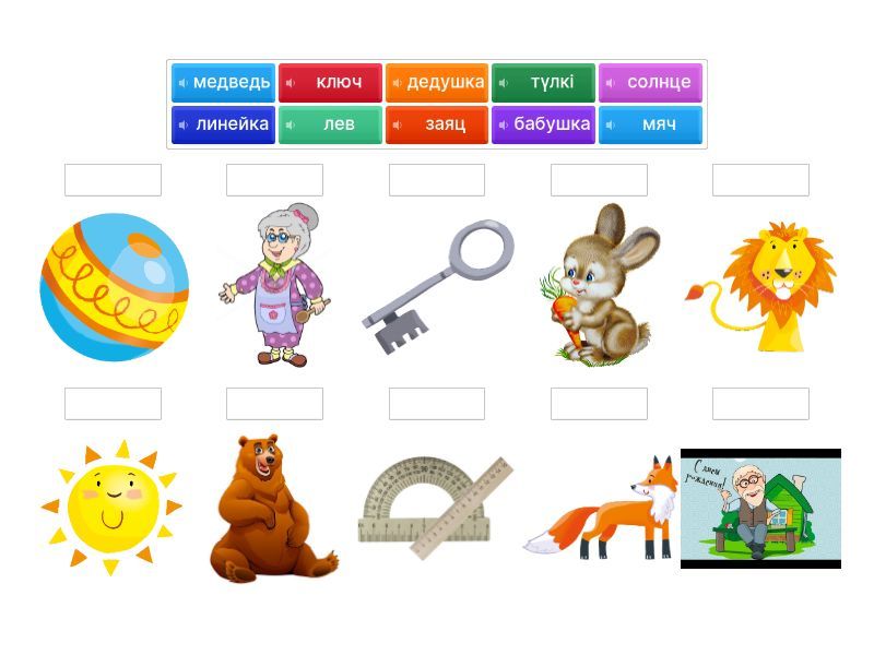 девочка, түлкі, помидор, солнце, ключ, обезьяна, лев, слон, заяц, мяч, яблоко, медведь, волк, школа, доска, книга, тетрадь, линейка, бабушка, дедушка,