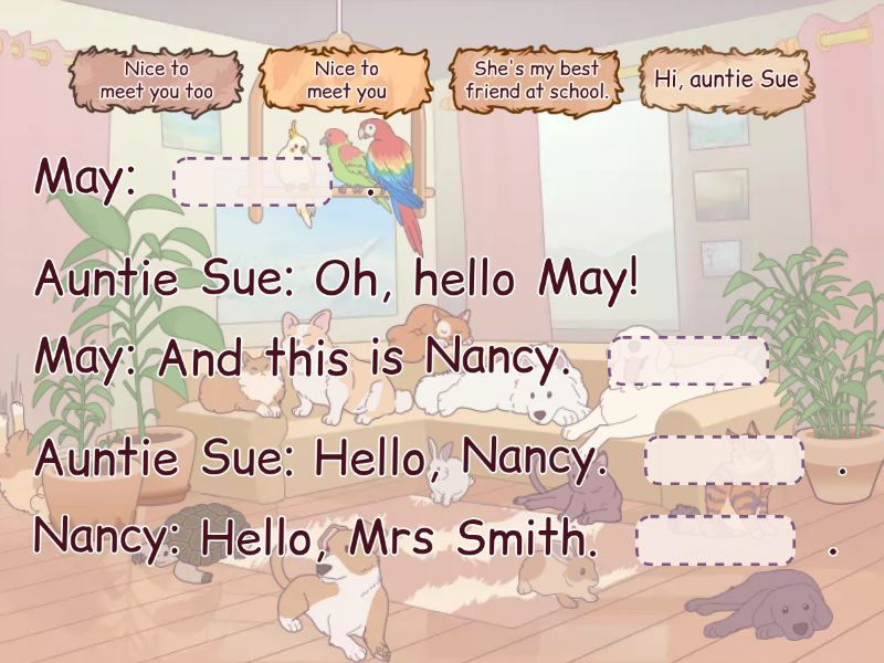 May: ____ . Auntie Sue: Oh, hello May! May: And this is Nancy. ____ Auntie Sue: Hello, Nancy. ____ . Nancy: Hello, Mrs Smith. ____ .
