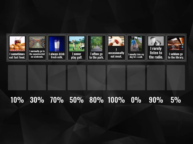 I always drink fresh milk. - 100%, I usually take my dog for a walk. - 90%, I normally go to the supermarket on weekends. - 80%, I often go to the park. - 70%, I sometimes eat fast food. - 50%, I occasionally eat meat. - 30%, I seldom go to the library. - 10%, I rarely listen to the radio. - 5%, I never play golf. - 0% ,