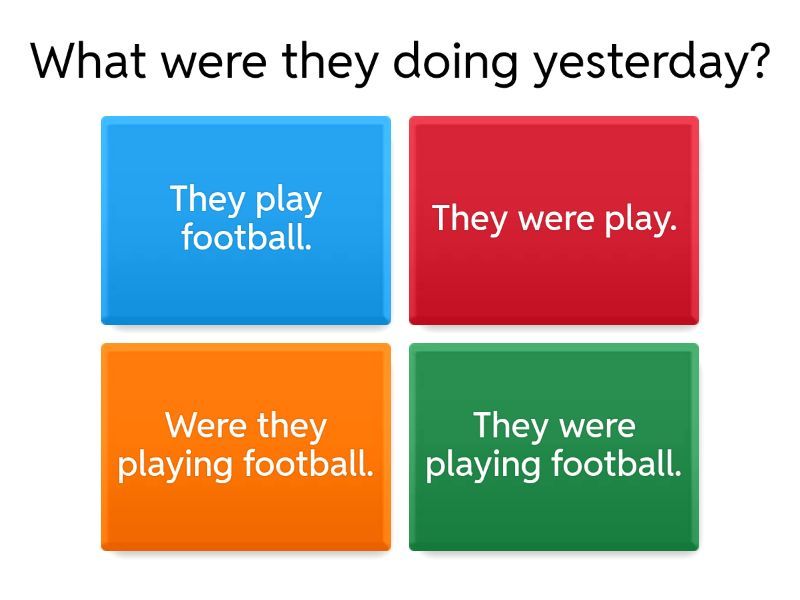 1) What were they doing yesterday? a) They play football. b) They were play. c) Were they playing football. d) They were playing football. 2) Were Daniel and Lera having fun at the party? a) No, they were. b) No, they weren’t! c) Yes, they wren't d) No, they wasn’t. 3) Was your cousin working? a) Working was he b) Yes, he isn't c) Yes, he was. d) No, he weren’t! 4) What was dad doing this evening? a) He were playing basketball. b) Playing was he. c) He was playing the violin. d) No, he wasn’t. 5) Was it sunny yesterday? a) They were. b) Yes, he was. c) No, it weren’t! d) No, it wasn’t. 6) What were you doing in your room? a) I was tidying up. b) I were tidying up. c) I was tidy up. d) I were tidy up. 7) Was she playing hockey yesterday? a) Yes, she were. b) No, he wasn't c) No, she wasn’t. d) No, she weren’t!