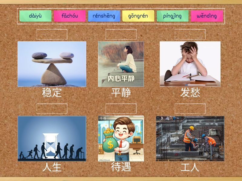 rénshēng - 人生, gōngrén - 工人, wěndìng - 稳定, dàiyù - 待遇, fāchóu - 发愁, píngjìng - 平静,