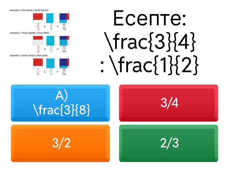 1) Есепте: \frac{3}{4} : \frac{1}{2} a) A) \frac{3}{8} b) 3/4 c) 3/2 d) 2/3 2) Есепте: \frac{5}{6} : \frac{5}{12} a) 2 b) 1 c) 4 d) 5/18 3) Есепте: \frac{7}{9} : \frac{1}{3} a) 7/3 b) 7/27 c) 1/3 d) 3/7 4) Есепте: 2 \frac{1}{4} : \frac{1}{2} a) A) 2 \frac{1}{4} b) 4 \frac{1}{2} c) 1 \frac{1}{8} d) 3 5) Есепте: 1 \frac{3}{5} : \frac{2}{5} a) 4 b) 2 c) 3 d) 5 6) Есепте: \frac{4}{7} : 2 a) A) \frac{4}{14} b) 2/7 c) 7/2 d) 1/2