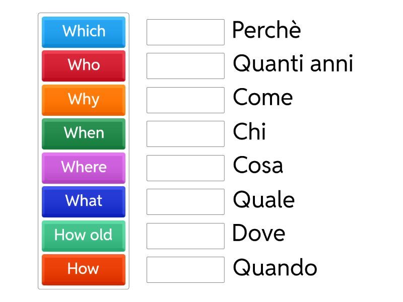 What - Cosa, When - Quando, Why - Perchè, How - Come, Which - Quale, Where - Dove, How old - Quanti anni , Who - Chi,