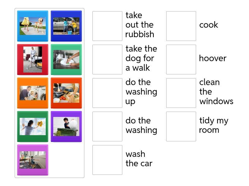 tidy my room, cook, take the dog for a walk, do the washing up, do the washing, wash the car, clean the windows, hoover, take out the rubbish,