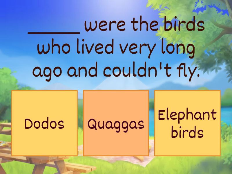 1) _____ were the birds who lived very long ago and couldn't fly. a) Dodos b) Quaggas c) Elephant birds 2) _____ were very tall and too heavy to fly. a) Dodos b) Quaggas c) Elephant birds 3) _____ looked like zebras with stripes only on the fronts of their bodies. a) Dodos b) Quaggas c) Elephant birds 4) _____ lived in the ocean and looked like sea lions. a) Sea wolves b) Wooly mammoths. 5) _____ were related to elephants. a) Sea wolves b) Wooly mammoths 6) Which animals were extinct? a) Dodos b) Quaggas c) Sea lions d) snow leopards 7) Which animals are endangered? a) Polar bears b) big pandas c) Wooly mammoths d) Sea wolves 8) The synonym of "nature reserve" is ... . a) a sanctuary b) a shadow c) a cage