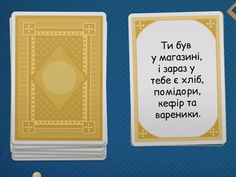 На вулиці дуже холодно. Мінус 20 градусів., Ти гарячий. У тебе температура Плюс 39 градусів., Ти у кімнаті, але там темно. У тебе є книжка, блокнот та ручка., На вулиці йде сильний дощ і вітер., Ти був у магазині, і зараз у тебе є хліб, помідори, кефір та вареники., Ти у бібліотеці, і там теж інші студенти, тому що завтра у вас іспит., На вулиці дуже сонячно..