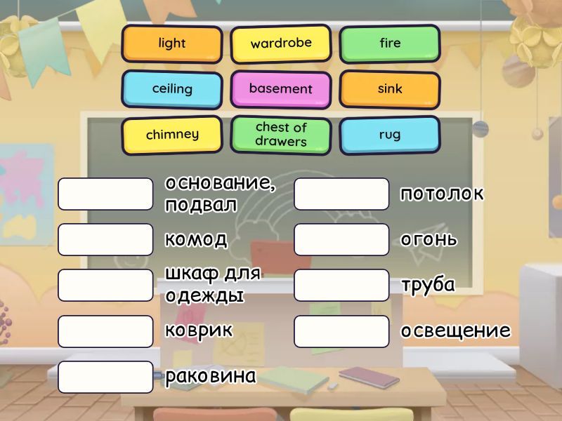 attic - чердак, dining room - столовая, basement - основание, подвал, hall - зал, корридор, chest of drawers - комод, curtain - штора, light - освещение, rug - коврик, radiator - батарея, sink - раковина , wardrobe - шкаф для одежды, ceiling - потолок, roof - крыша, floor - пол, chimney - труба, fire - огонь, wall - стена,