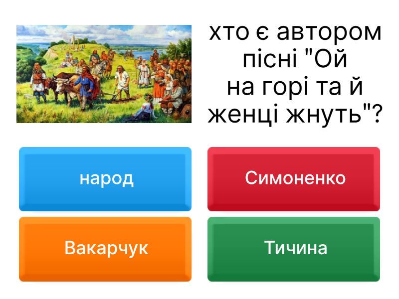 1) хто є автором пісні "Ой на горі та й женці жнуть"? a) народ b) Симоненко c) Вакарчук d) Тичина 2) "Ой у лузі та ще й при березі" - це a) пісня про кохання b) стрілецька пісня c) жартівлива пісня d) козацька пісня 3) Який твір Шевченка розкриває тему зневаги до пам'яті предків та руйнування святинь? a) Заповіт b) Розрита могила c) Кавказ d) Сон 4) Образи смертельної небезпеки та краси поєднуються у творі - a) Журавлі b) Стефанія c) Квіти мінних зон 5) Хто написав "Мій друже Ковалю"? a) Матола b) Чайковський 6) У пісні "Біля тополі" Солодухи герой - a) гуляє з дівчиною b) вирушає на війну c) прощається з мамою d) шукає домівку 7) У якій пісні символом сили нації виступає рослина? a) Ой у лузі червона калина b) Квіти мінних зон