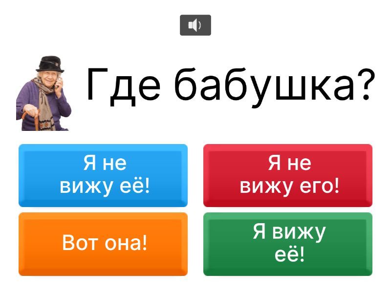 1) Где тигр? a) Вот он! b) Вот она! c) Я вижу его! d) Я не вижу её! 2) Где дерево? a) Вот оно! b) Вот он! c) Я вижу его! d) Я не вижу её! 3) Где бабушка? a) Вот она! b) Я не вижу его! c) Я вижу её! d) Я не вижу её! 4) Где книга? a) Вот она! b) Я вижу её! c) Я вижу его! d) Я не вижу её! 5) Где обезьяна? a) Вот она! b) Я вижу её! c) Я вижу его! d) Я не вижу его! 6) Где слон? a) Вот он! b) Я вижу её! c) Я вижу его! d) Вот она! 7) Где облако? a) Вот он! b) Я вижу её! c) Я вижу его! d) Вот оно! 8) Где верблюд? a) Вот он! b) Я вижу её! c) Я вижу его! d) Вот оно!