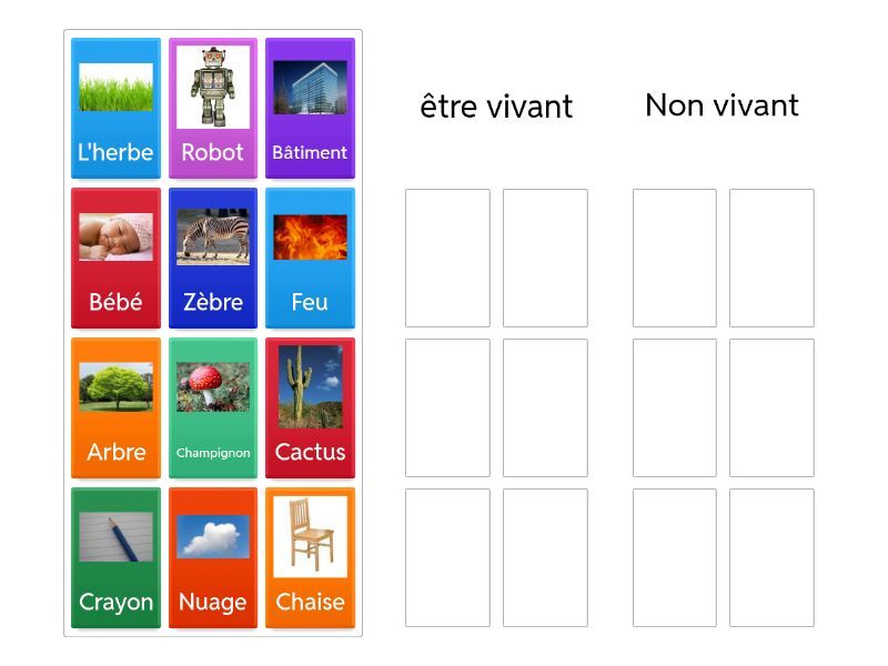 être vivant: Bébé, Arbre, Zèbre, L'herbe, Champignon, Cactus, Non vivant: Bâtiment, Feu, Robot, Crayon, Chaise, Nuage,