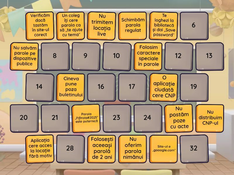 Nu oferim parola nimănui - Un coleg îți cere parola ca să „te ajute cu tema”, Nu salvăm parole pe dispozitive publice - Te loghezi la bibliotecă și dai „Save password”, Verificăm dacă tastăm în site-ul corect - Site-ul e „gooogle.com”, Folosim caractere speciale în parole - Parola „P@rola#2025” este puternică, Schimbăm parola regulat - Folosești aceeași parolă de 2 ani, Nu postăm poze cu acte - Cineva pune poza buletinului, Nu distribuim CNP-ul - O aplicație ciudată cere CNP, Nu trimitem locația live - Aplicația cere acces la locație fără motiv, Verificăm cine poate vedea postările - Ai profil complet public, Blurăm informațiile sensibile - Trimiți o poză cu biletul cu cod vizibil, Nu vorbim cu necunoscuți - Primești mesaj: „Salut, vrei să fii prietenul meu?”, Verificăm identitatea persoanelor - Cineva pretinde că este colega ta, dar nu scrie ca ea, Nu dăm date pe site-uri nesigure - Formular fără „https”, Nu deschidem linkuri suspecte - Primești „Ai câștigat un iPhone!”, Raportăm spamul - Emailul te anunță „contul va fi șters în 3 ore”., Folosim antivirus - Apare un program necunoscut în telefon,