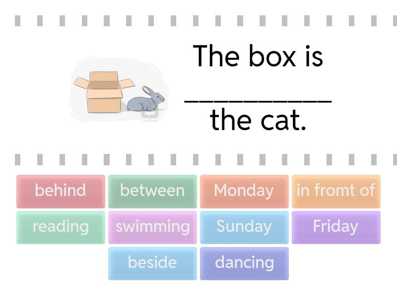 beside - The box is __________ the cat., behind - The cat is __________ the box., in fromt of - The TV is __________ the person., between - She is __________ the boy and the girl., swimming - He is __________ in the pool., dancing - She is __________ to the music., reading - The girl is __________ a storybook, Monday - On______, there is a flag ceremony., Friday - On _______, it is a blessed day., Sunday - I get holiday on_____.,