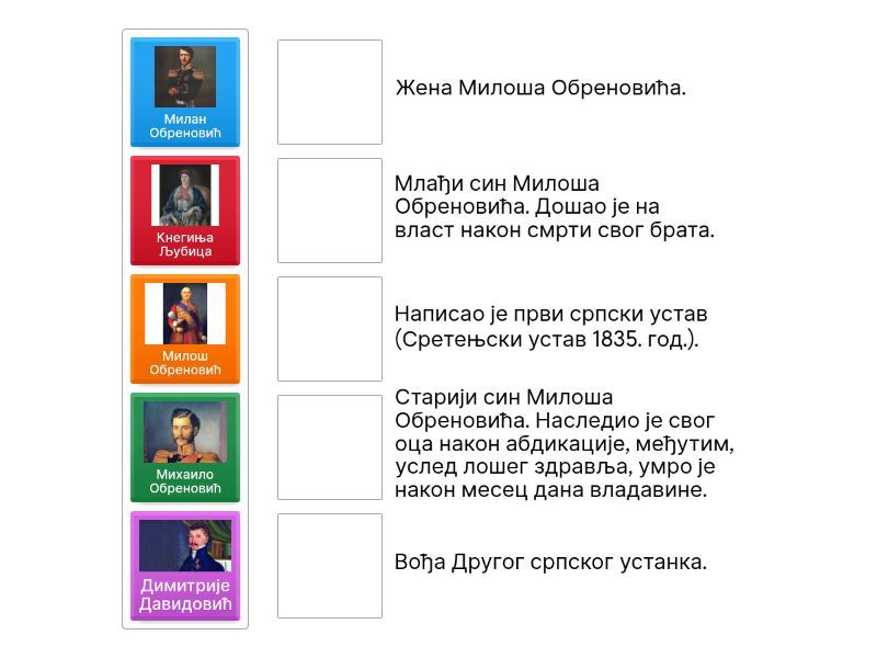 Милош Обреновић - Вођа Другог српског устанка., Димитрије Давидовић - Написао је први српски устав (Сретењски устав 1835. год.)., Милан Обреновић - Старији син Милоша Обреновића. Наследио је свог оца након абдикације, међутим, услед лошег здравља, умро је након месец дана владавине., Михаило Обреновић - Млађи син Милоша Обреновића. Дошао је на власт након смрти свог брата. , Кнегиња Љубица - Жена Милоша Обреновића.,
