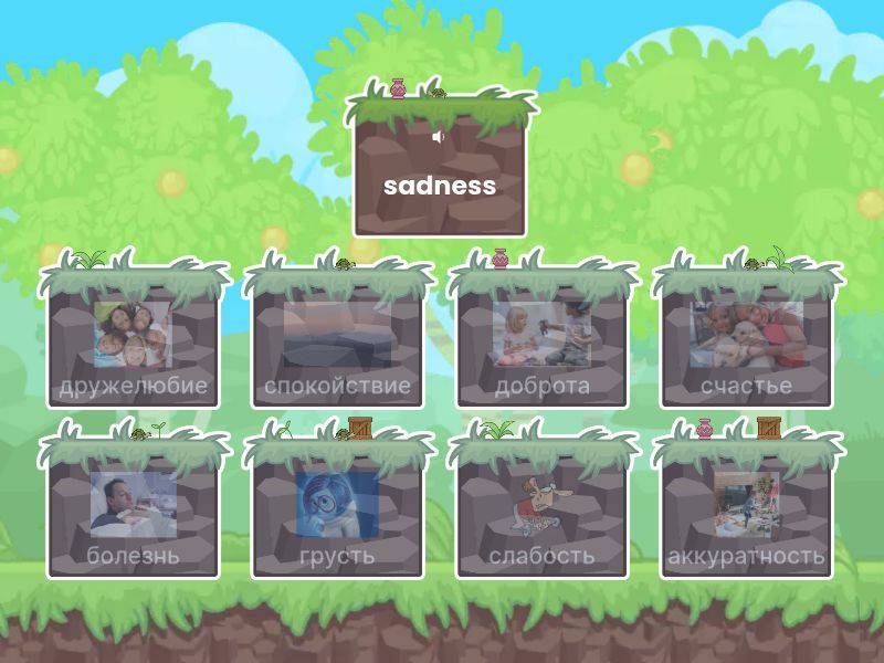 грусть - sadness, аккуратность - tidiness, слабость - weakness, болезнь - illness, счастье - happiness, доброта - kindness, дружелюбие - friendliness, спокойствие - quietness,