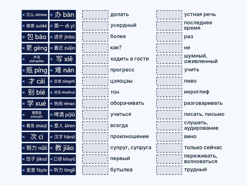 做客 zuòkè - ходить в гости , 爱人 àiren - супруг, супруга, 教 jiāo - учить, 包 bāo - оборачивать, 饺子 jiǎozi - цзяоцзы, 葡萄酒 pútaojiǔ - вино, 啤酒 píjiǔ - пиво, 才 cái - только сейчас , 热闹 rènao - шумный, оживленный, 瓶 píng - бутылка, 最近 zuìjìn - последнее время, 说话 shuōhuà - разговаривать, 第一 dì yī - первый, 次 cì - раз, 难 nán - трудный, 学 xué - учиться, 进步 jìnbù - прогресс, 努力 nǔlì - усердный, 发音 fāyīn - произношение, 口语 kǒuyǔ - устная речь, 听力 tīnglì - слушать, аудирование, 写 xiě - писать, письмо, 声调 shēngdiào - тон, 总是 zǒngshì - всегда, 怎么 zěnme - как?, 办 bàn - делать , 别 bié - не, 着急 zháojí - переживать, волноваться, 更 gèng - более, 汉字 hànzì - иероглиф,