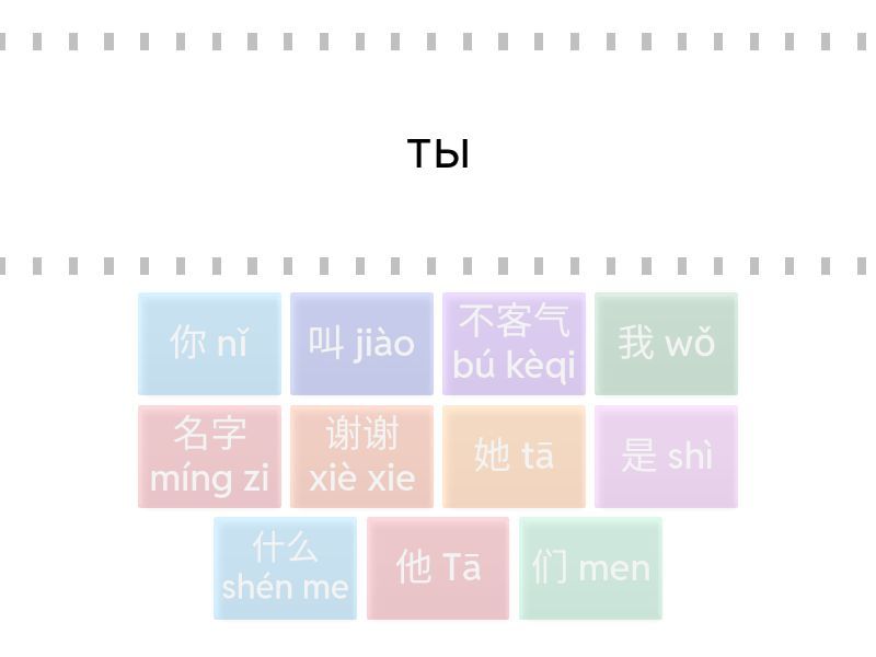 你 nǐ - ты, 他 Tā - он , 她 tā - она, 我 wǒ - я, 是 shì - являться , 叫 jiào - звать, называть , 们 men - частица множественного числа , 谢谢 xiè xie - спасибо , 不客⽓ bú kèqi - не стоит благодарности , 什么 shén me - что? какой?, 名字 míng zi - имя ,