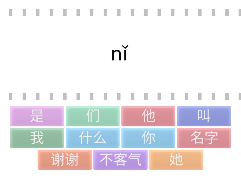 你 - nǐ, 他 - Tā, 她 - tā, 我 - wǒ, 是 - shì, 叫 - jiào, 们 - men, 谢谢 - xiè xie, 不客⽓ - bú kèqi, 什么 - shén me, 名字 - míng zi,
