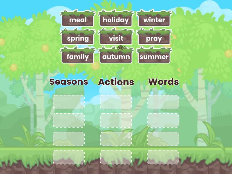 Seasons: winter, summer, spring, autumn, Actions: pray, visit, Words: meal, family, holiday,