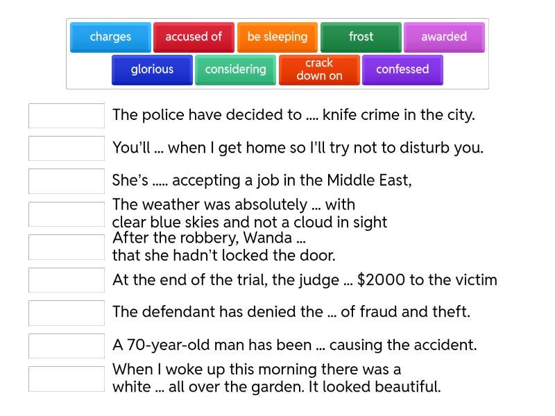 set - The unusually warm weather is .... to continue over the weekend., shouldn't - It’s just a small medical procedure so it ... be too painful., be sleeping - You’ll ... when I get home so I’ll try not to disturb you., considering - She’s ..... accepting a job in the Middle East,, hoping - They’re .... to find a cure for the disease in the near future., expected - The president’s plane is ..... to land at 5 o’clock this afternoon., throwing - Our neighbour admitted ... rubbish in our garden., blamed - The manager ... the mistake on one of the waiters., confessed - After the robbery, Wanda ... that she hadn’t locked the door., encouraged - When I was a child, my parents .... me to make as many friends as possible. , frost - When I woke up this morning there was a white ... all over the garden. It looked beautiful. , glorious - The weather was absolutely ... with clear blue skies and not a cloud in sight, miserable - The weather was pretty ... at the weekend so we just stayed at home. , pouring down - Don’t go out at the moment. It’s ... and you’ll get soaked., awarded - At the end of the trial, the judge ... $2000 to the victim, charges - The defendant has denied the ... of fraud and theft., crack down on - The police have decided to .... knife crime in the city. , accused of - A 70-year-old man has been ... causing the accident.,