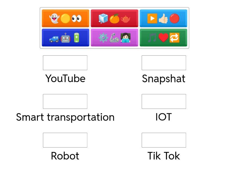 🧊🍊🫖 - IOT, 🎵♥️🔁 - Tik Tok, 👻🟡👀 - Snapshat, ⚙️🦾👩🏻💻 - Robot, 🚙🤖🔋 - Smart transportation, ▶️👍🏻🔴 - YouTube,