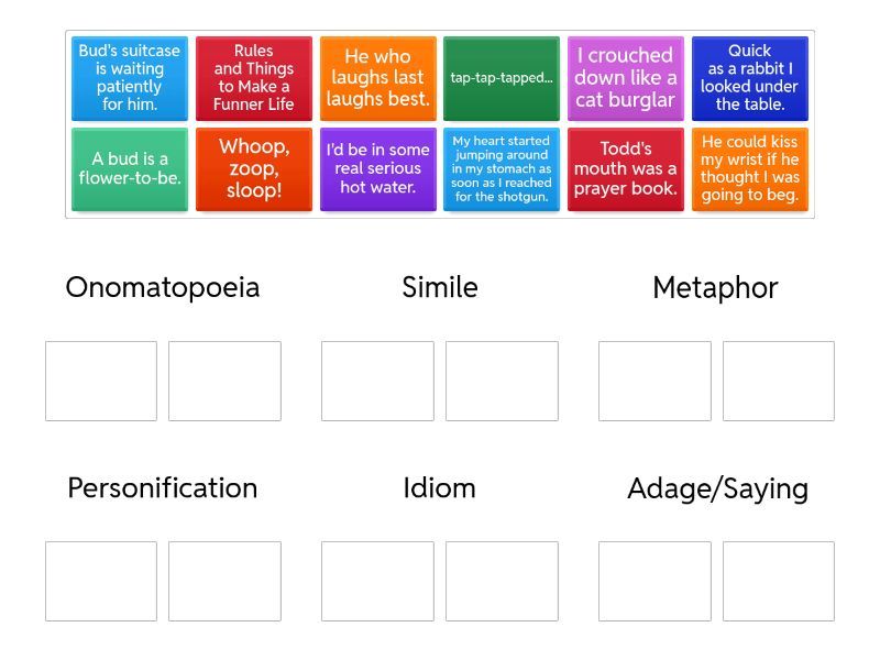 Onomatopoeia: Whoop, zoop, sloop!, tap-tap-tapped..., Simile: Quick as a rabbit I looked under the table., I crouched down like a cat burglar, Metaphor: Todd's mouth was a prayer book., A bud is a flower-to-be., Personification: My heart started jumping around in my stomach as soon as I reached for the shotgun., Bud's suitcase is waiting patiently for him., Idiom: He could kiss my wrist if he thought I was going to beg., I'd be in some real serious hot water., Adage/Saying: He who laughs last laughs best., Rules and Things to Make a Funner Life,