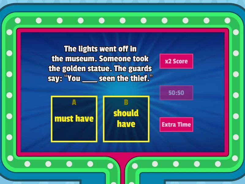 1) The lights went off in the museum. Someone took the golden statue. The guards say: “You ____ seen the thief.” a) must have b) should have 2) You forgot your best friend’s birthday yesterday. “You ____ called me… I was waiting!” a) should have b) needn't have 3) The cake is burnt. You ____ set the timer. a) must have b) should have 4) You missed the bus by 10 seconds. You think: “I ____ run faster!” a) could have b) couldn't have 5) Your friend looks tired. “You ____ slept very late.” a) can't have b) must have 6) The kitchen smells amazing. “You ____ baked something delicious!” a) must have b) can't have 7) Your shoes are wet. It’s sunny outside. Your friend says: “You ____ stepped in a puddle.” a) might not have b) must have 8) He knows every detail about the new Marvel movie, but it was released only two hours ago. “He ___ watched it already!” a) can't have b) should have 9) She’s walking very slowly and carefully today. “She ___ hurt her foot.” a) might have b) should have 10) You’re sunburnt all over your face and it hurts a lot. “You ___ put on sunscreen!” a) should have b) needn't have 11) She bought an expensive concert ticket but got sick and couldn’t go. “She ___ bought the tickets.” a) shouldn't have b) must have 12) He printed 50 copies of the document, but the meeting was cancelled. “He ___ printed so many copies.” a) can't have b) needn't have 13) She got food poisoning from that restaurant. “We ___ eaten somewhere else.” a) shouldn't have b) could have 14) She’s not answering her phone and it’s 2 a.m. “She ___ gone to bed early. a) might have b) can't have