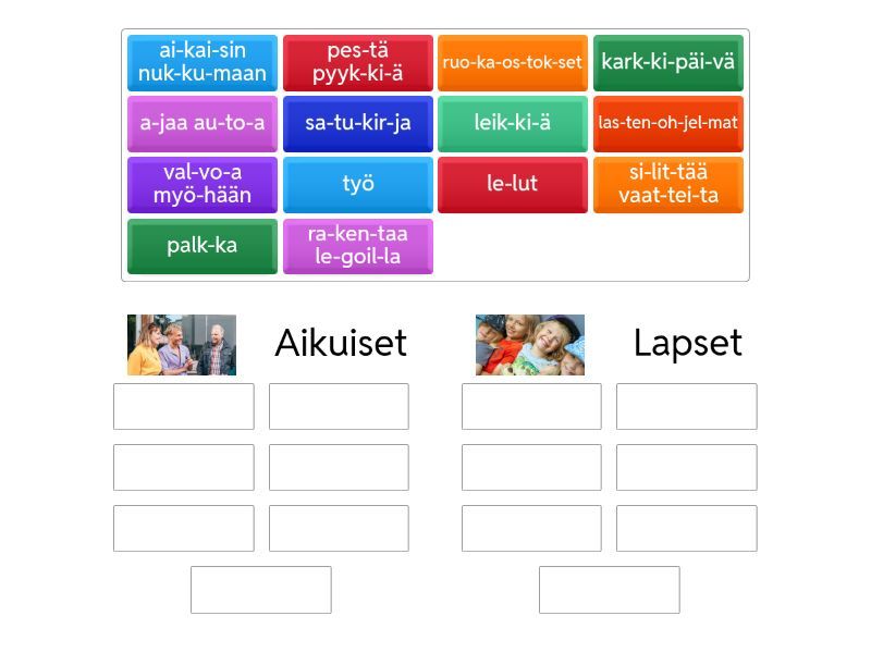 Aikuiset: palk-ka, ruo-ka-os-tok-set, työ, val-vo-a myö-hään, pes-tä pyyk-ki-ä, a-jaa au-to-a, si-lit-tää vaat-tei-ta, Lapset: sa-tu-kir-ja, le-lut, las-ten-oh-jel-mat, ai-kai-sin nuk-ku-maan, leik-ki-ä, ra-ken-taa le-goil-la, kark-ki-päi-vä,