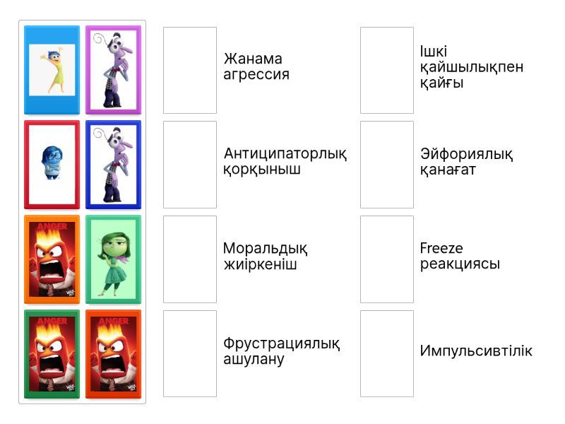 Эйфориялық қанағат, Эмоционалды қауіпсіздік сезімі, Қысқа мерзімді жеңіс сезімі, Ішкі қайшылықпен қайғы, Өткенге ностальгиялық сағыныш, Жоғалған мүмкіндік қайғысы, Жанама агрессия, Фрустрациялық ашулану, Импульсивтілік, Антиципаторлық қорқыныш, Freeze реакциясы, Қауіпті когнитивті бағалау, Ішкі наразылық, Сақтықпен үйлескен жағымсыздық, Моральдық жиіркеніш,