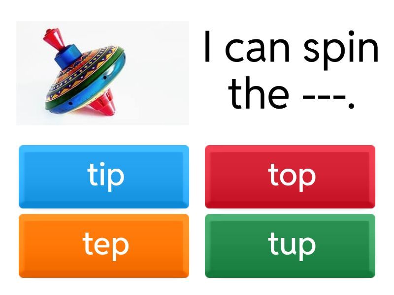 1) I can spin the ---. a) tip b) top c) tep d) tup 2) We ---- at the red sign. a) stip b) step c) stop d) stap 3) The --- walk to the park. a) men b) man c) min d) mun 4) Dad can fix the bike. a) fax b) fex c) fux d) fix 5) The --- ran fast. a) fax b) fox c) fix d) fux 6) I put my toy in the ---. a) box b) bix c) bux d) bax 7) I have --- crayons. a) sax b) sux c) sixx d) six 8) We look at the map. a) map b) mip c) mep d) mup 9) I jump on my ---. a) deb b) bed c) ded d) bad 10) I write with my ---. a) pan b) pin c) pen d) pun 11) ---- will we go home? a) Wen b) Win c) wan d) When