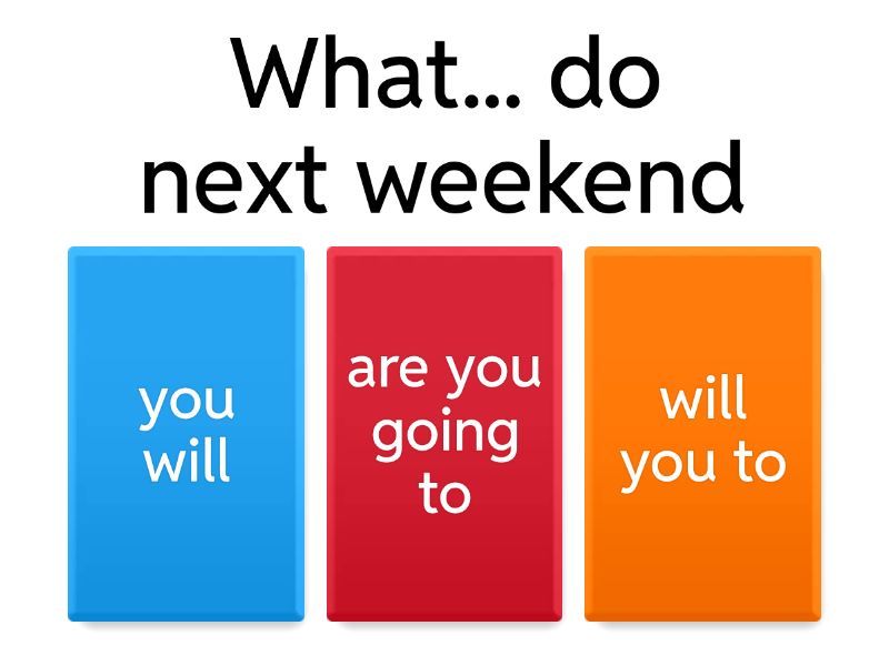 1) What... do next weekend a) you will b) are you going to c) will you to 2) I think I ... to bed. I`m tired a) going b) am going c) will go 3) They.... study together tomorrow a) will b) will go c) are going to 4) Temperatures..... probably rise in the future a) going to b) will c) are going to 5) What ...... the weather ...... like tomorrow? a) is ... going b) will ... be c) will ... to 6) How about meeting at 7:00? I can't, I ..... visit my grandparents. a) is going to b) will c) I`m going to 7) Kanat ...... on holiday to Spain tomorrow. a) is going to go b) will c) is going to 8) Be careful or you .... a) will fall b) are going to fall c) are falling