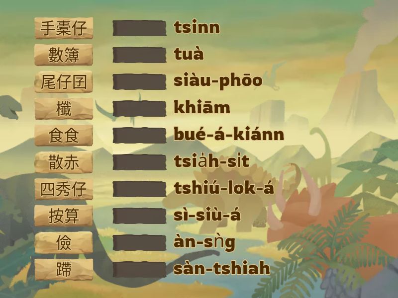 四秀仔 - sì-siù-á, 買物 - bé-mi̍h, 食食 - tsia̍h-si̍t, 撋 - nuá, 櫼 - tsinn, 頂懸 - tíng-kuân, 啖糝 - tām-sám, 𨑨迌 - tshit-thô, 散赤 - sàn-tshiah, 按算 - àn-sǹg, 趁錢 - thàn-tsînn, 紩 - thīnn, 手橐仔 - tshiú-lok-á, 蹛 - tuà, 尾仔囝 - bué-á-kiánn, 暝日 - mê-ji̍t, 數簿 - siàu-phōo, 儉 - khiām, 央 - iang, 寡 - kuá,